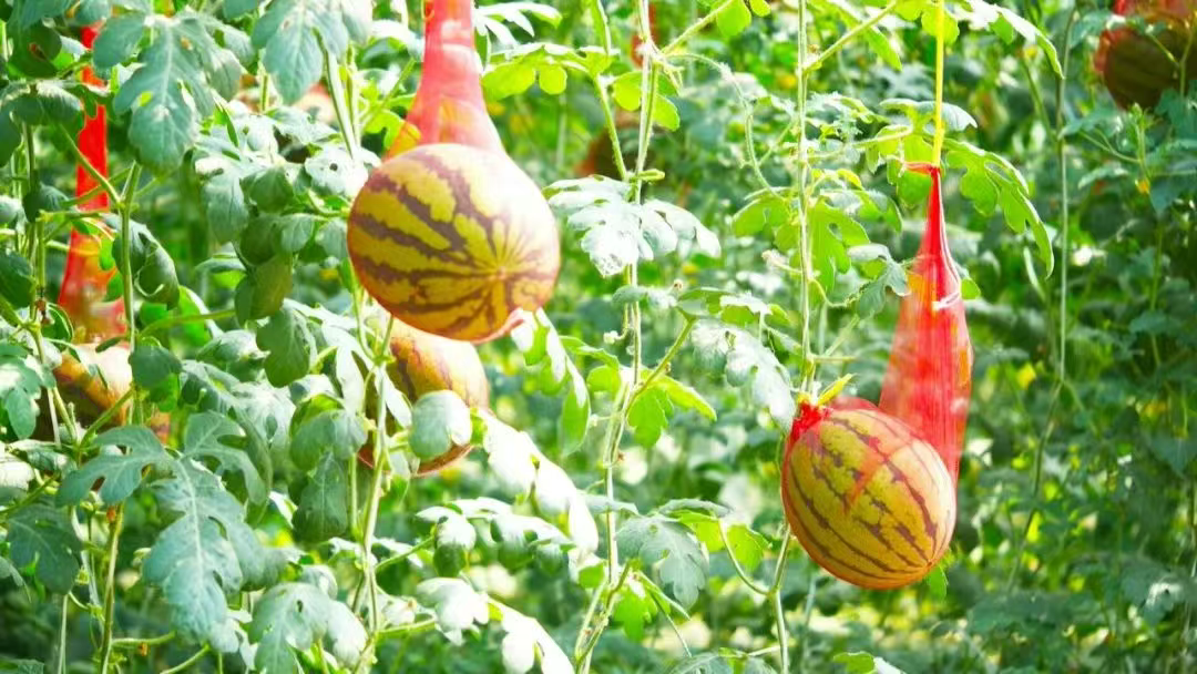 走进种植大棚一排排吊秧瓜整齐悬挂