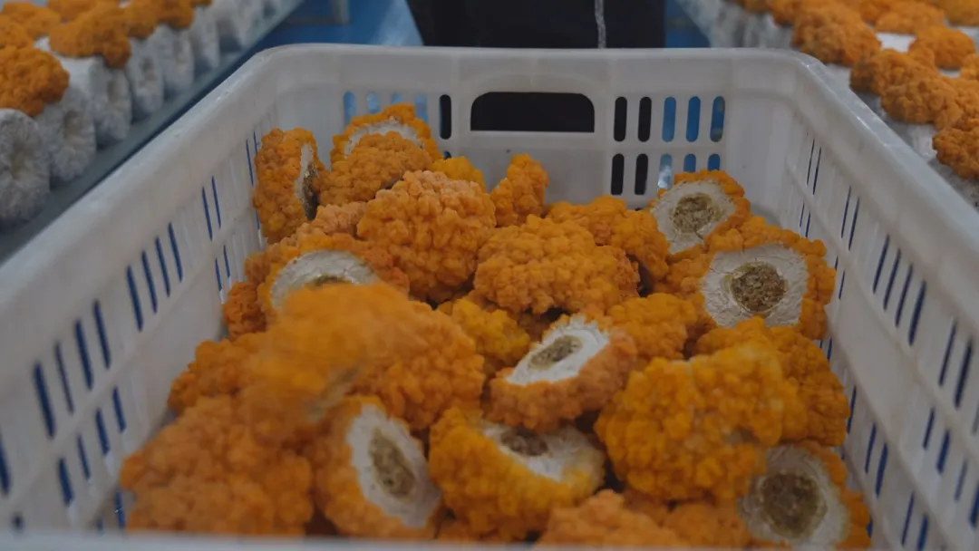 经过精心培育和悉心照料,首批金耳菌试种成功,顺利采摘入库、精装上市。走进食用菌云仓,10个占地约600平方米、配备智能化温控系统的“高科技小屋”整齐排列。每个云仓批次产量约2500公斤,一朵朵色泽金黄、形状饱满的金耳菌,宛如金色的花朵,在云仓中绽放。