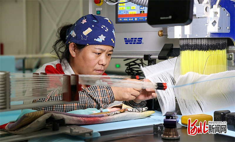 7月15日,河北鹤煌网业股份有限公司工人正在进行丝网插接作业。 河北日报记者 李佳泽摄