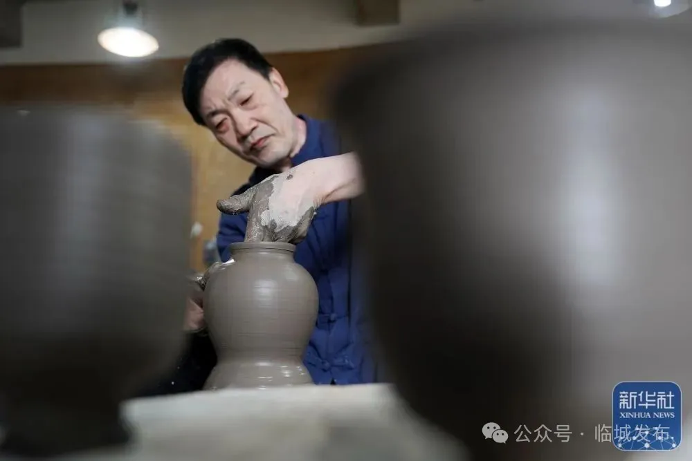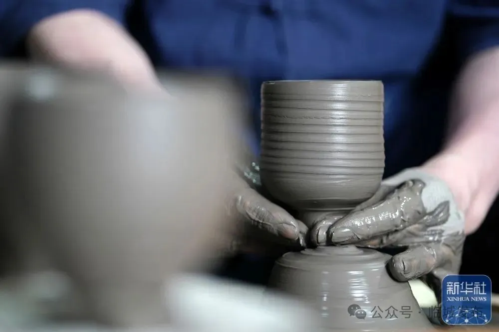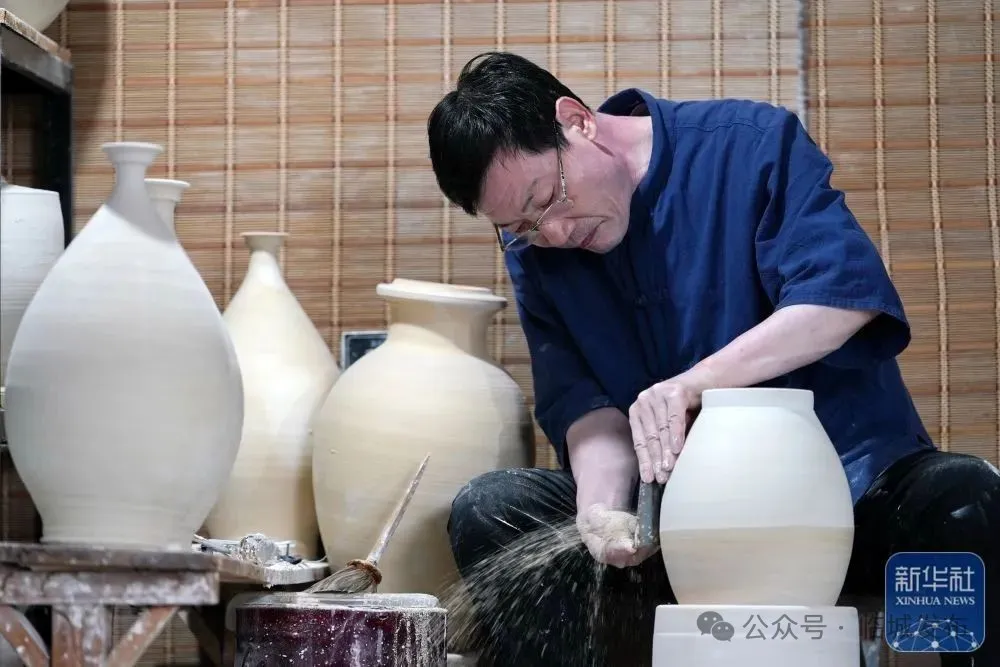 ↑ 6月28日,在河北省临城县邢窑文化博览园,张志忠进行邢白瓷拉坯作业。