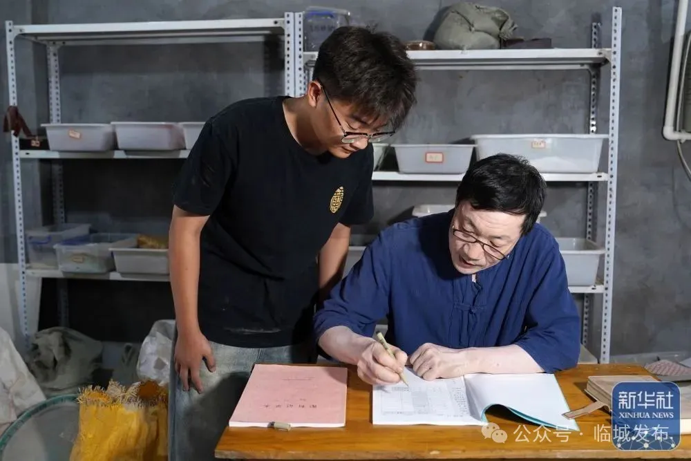 ↑ 6月28日,张志忠(右)和学生研究记录烧制白瓷的原料配方。