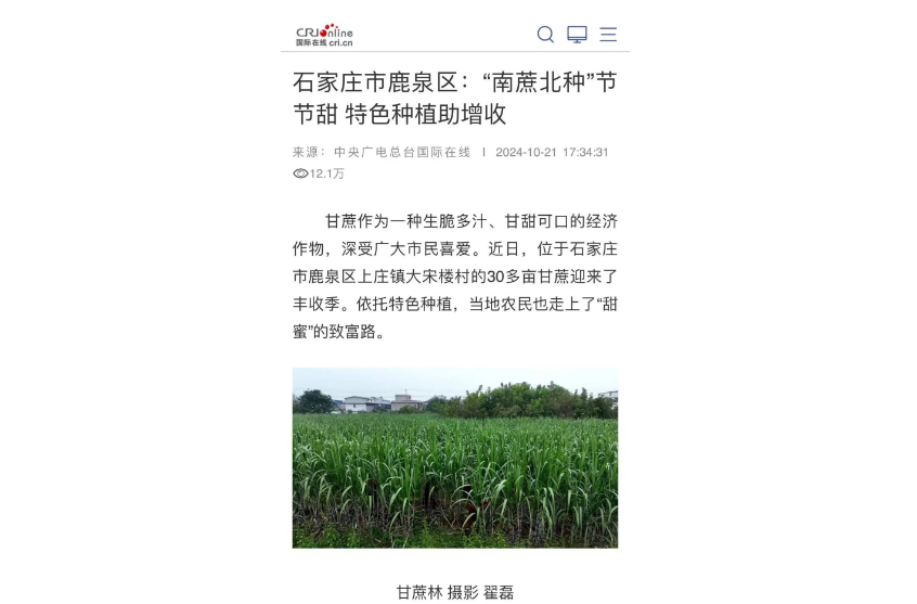 甘蔗作为一种生脆多汁、甘甜可口的经济作物,深受广大市民喜爱。近日,位于石家庄市鹿泉区上庄镇大宋楼村的30多亩甘蔗迎来了丰收季。依托特色种植,当地农民也走上了“甜蜜”的致富路。
