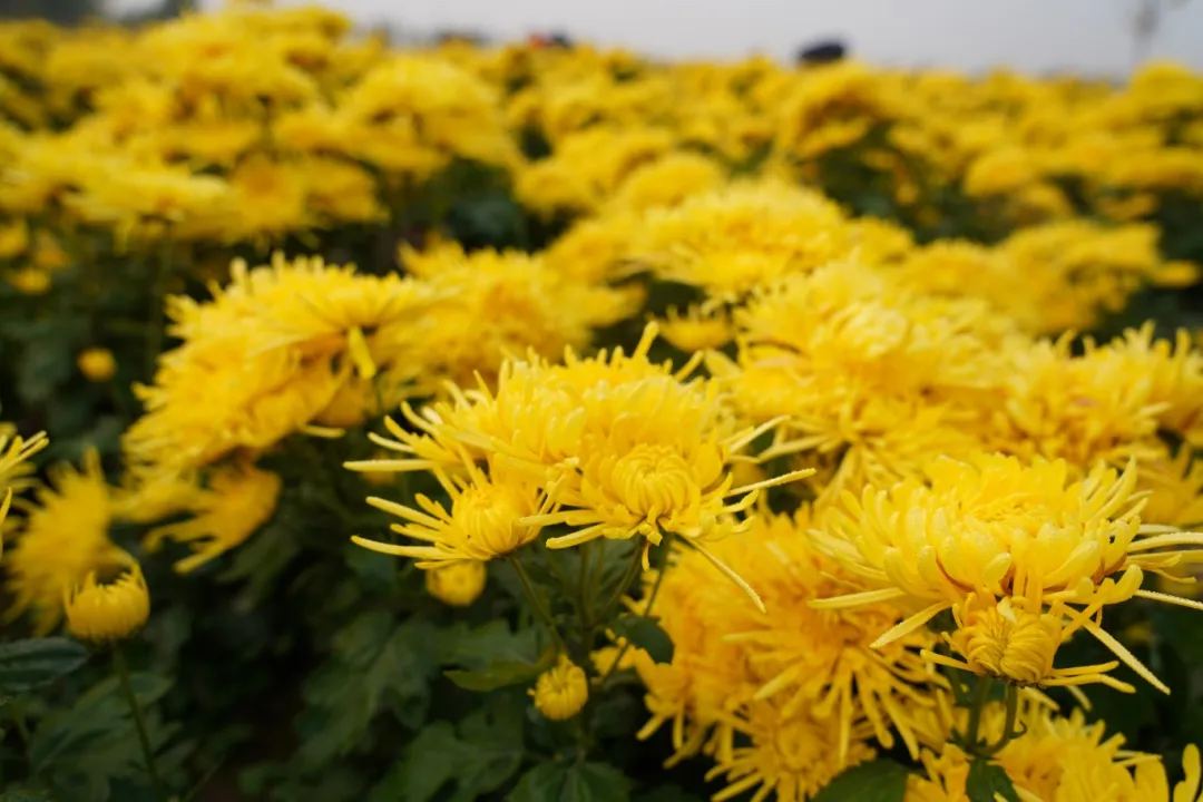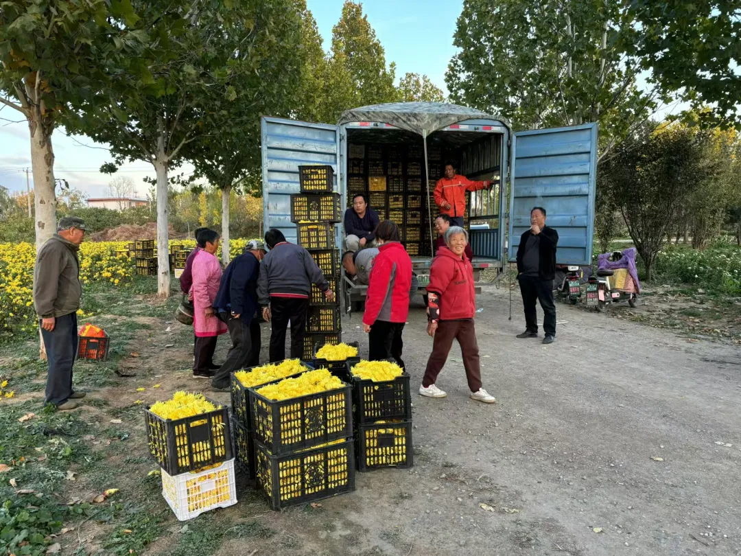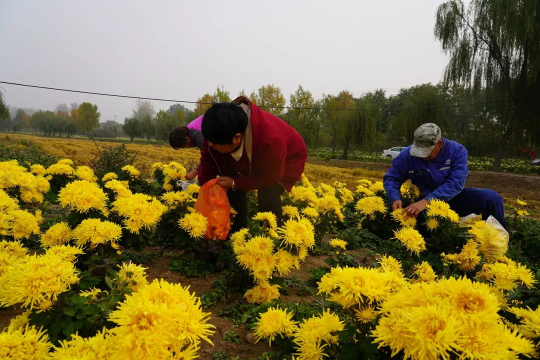 一朵朵菊花竞相绽放,色泽或金黄,或洁白,尽显清新淡雅。村民们穿梭在花田中采摘菊花,动作娴熟,盛放的菊花映着工人们的笑脸,构成了一幅美丽画卷。
