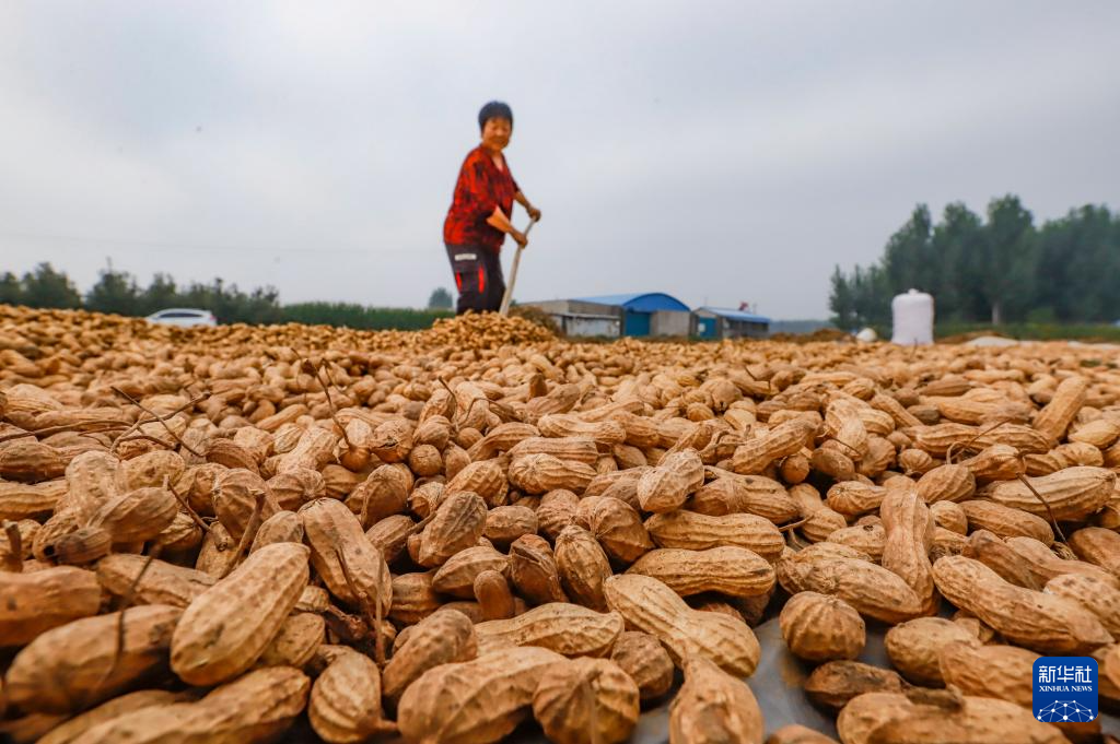 9月11日,河北省遵化市东新庄镇农民在场院晾晒花生。 新华社发(刘满仓摄)