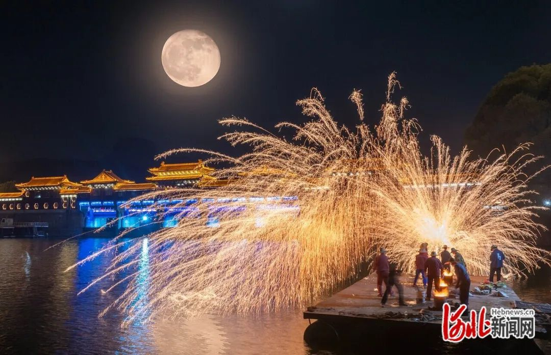 9月16日,游客在武安京娘湖景区观赏打铁花表演。李树锋摄