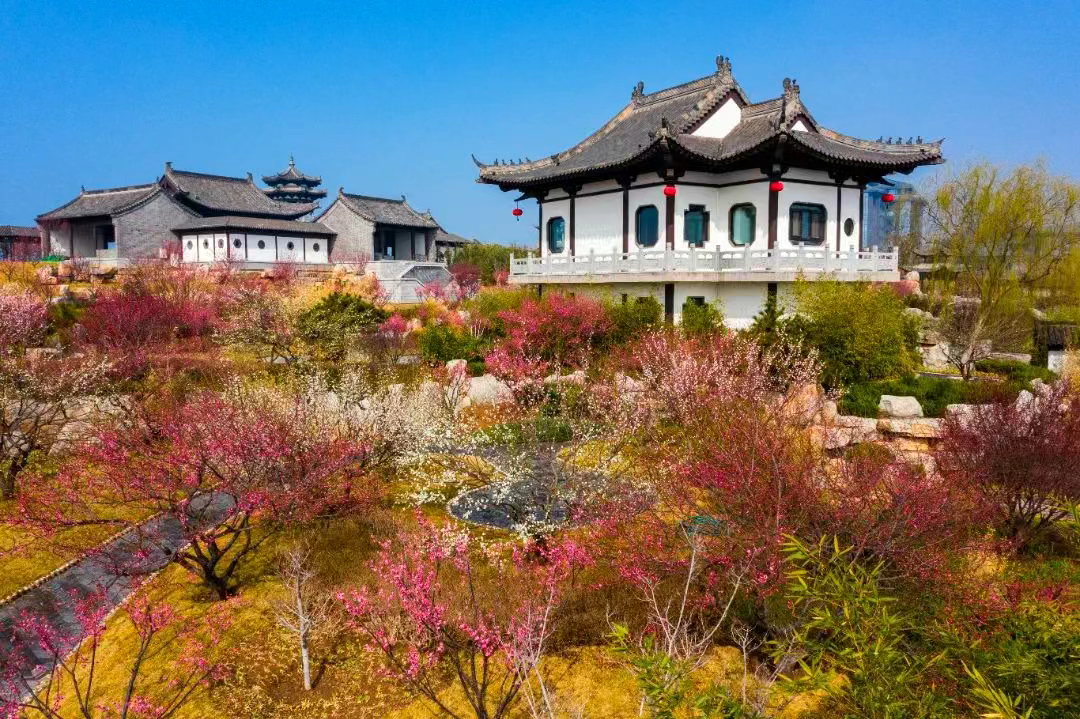亮点:园内朱砂梅、素心梅、腊梅、美人梅……一簇簇梅花,层层叠叠缀满枝头,或含苞欲放、或宁静绽放。白色、嫩黄色、粉红色的花瓣在枝头轻轻摇曳,和远处的白墙灰瓦遥相呼应,别有一番静谧之美。大片盛放的迎春花,如同洒金一般热烈而明媚缤纷的色彩,相互交织成一幅醉人的春景图。搭配古色古香的建筑群,展现“北国雄风”与“情景江南”的意境。