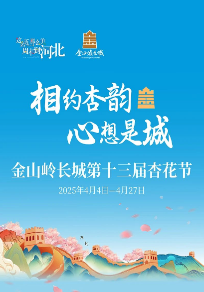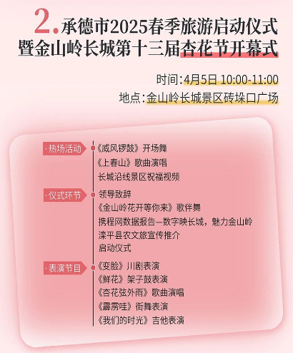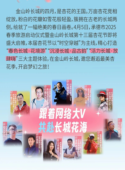 春日游,杏花吹满头。当万里长城邂逅万亩杏花,当历史烽烟与春日浪漫交织,一场跨越时空的春日盛宴翩然而至。4月5日,“相约杏韵 心想是城”承德市2025春季旅游启动仪式暨金山岭长城第十三届杏花节开幕式即将盛大启幕!本届杏花节将从4月4日持续至4月27日,以“时空穿越”为主线,串联杏花自然美景、边塞沉浸场景、历史文化底蕴三个维度,融合非遗展演、国风体验、文旅互动,更有“杏约长城·守护与传承——长城老郭粉丝分享会”首发登场,带你沉浸式解锁长城春日的N种玩法,春日限定,不容错过!