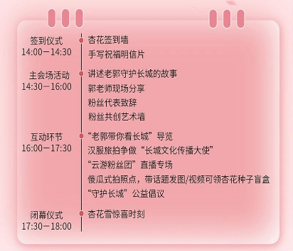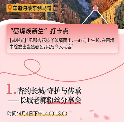 整个杏花节期间,各类精彩活动将持续不断。4月4日下午,“杏约长城·守护与传承——长城老郭粉丝分享会”温情开启。在这里,你不仅能聆听长城守护者老郭与长城的动人故事,还能参与沉浸式文化体验活动。跟着老郭徒步将军楼至花楼天梯,沿途了解敌楼构造、长城防御体系,参与趣味问答赢取杏花节限定文创产品。活动中还有汉服旅拍、直播联动等环节,线上线下双向奔赴,共同感受长城文化的魅力。