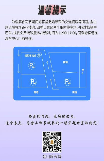 杏花纷飞处,长城候君来。这个春天,与金山岭共赴一场横跨历史与自然的浪漫之约。赏烽火台畔杏雪如海,品边塞集市人间烟火,探长城文化源远流长。