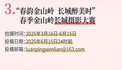 此外,开幕式当天将开启“金山岭长城云端赏花会”直播活动,抖音、微博多平台同步直播,足不出户赏花海盛景。喜欢摄影的朋友千万不要错过本届春季金山岭长城摄影大赛,3月16日至6月15日期间,用镜头捕捉长城的春日晨雾、山花烂漫、蜿蜒身姿以及人文活动与自然景观融合场景,赢千元奖金与住宿礼遇。