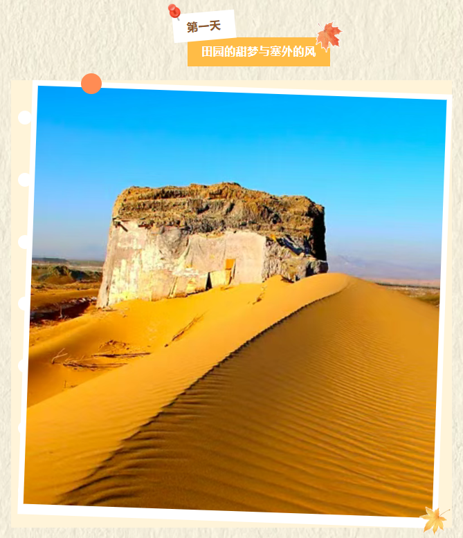 秋风在这里褪去了温柔,裹挟着塞外的豪情,吹起沙粒,如烟如幕。站在沙丘上,看夕阳将天与地染成统一的赭金色,心中会涌起一股“大漠孤烟直”的悲壮与辽阔。一日之内,从田园到戈壁,像是经历了两种截然不同的人生。