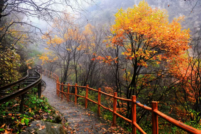 古寺秋景更添禅意,仙人寺隐匿于深山密林中,被五彩林木环绕,晨钟暮鼓间,落叶飘落在青石板路上,阳光透过枝叶洒在斑驳的寺墙上,既有自然之美,又含人文韵味,成为游客寻静赏秋的好去处。