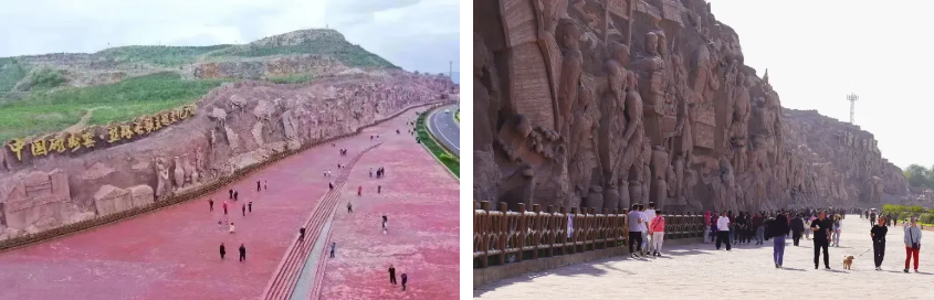 中国磁州窑•丝路长歌主题文化广场位于峰峰磁州窑路(原新义公路)中段,浮雕全长1000米、高30米,是以磁州窑大型山体浮雕为核心的文旅景点。