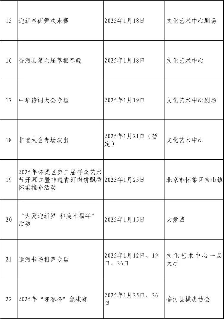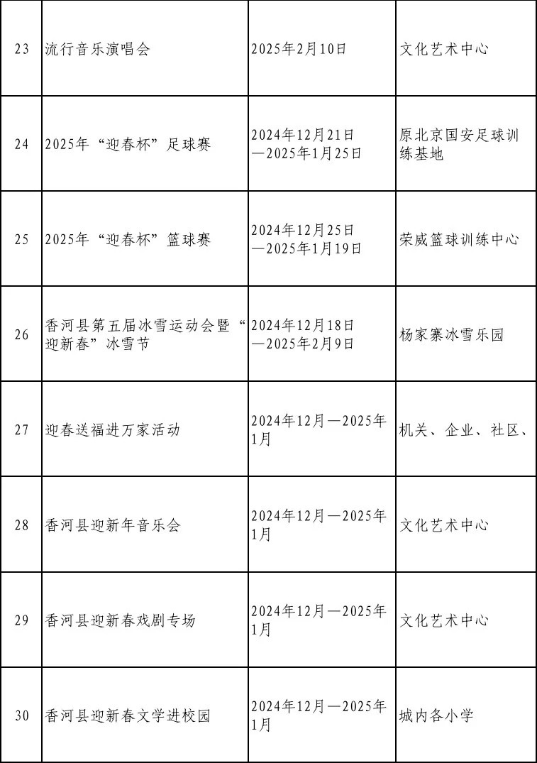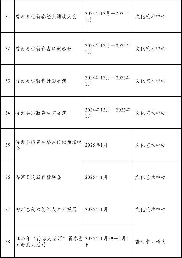 2025年是“十四五”规划的收官一年。为充分展示我县经济社会发展成果,满足广大群众的精神文化需求,营造喜庆祥和的节日氛围,我县在元旦、春节期间推出了一系列富有香河特色的文化活动,让广大人民群众乐享“文化盛宴”。