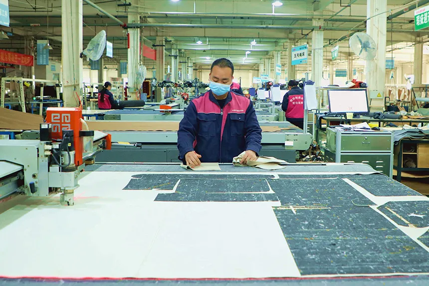 在香河经开区淑阳工业园内,爱依瑞斯廊坊家具有限公司作为智慧家居集群企业,在其皮沙发成品车间内,工人正对新款沙发成品进行质量检验。由于新款沙发增加了智慧功能性设计,从而舒适度更高,深受顾客喜爱,销售量实现大幅增长。