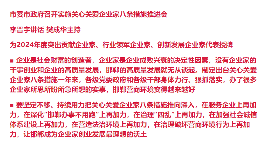1月23日,市委、市政府召开实施关心关爱企业家八条措施推进会,深入学习贯彻习近平总书记关于优化营商环境的重要指示精神,认真落实省委十届七次全会和市委十届九次全会部署,为2024年度突出贡献企业家、行业领军企业家、创新发展企业家代表授牌,向全社会亮明市委、市政府尊重企业、尊重企业家、服务企业、服务企业家的鲜明态度,为邯郸高质量发展和中国式现代化建设注入不竭动力。市委书记李晋宇出席并讲话,市长樊成华主持会议。市委副书记徐翀、市政协主席韩俊兰等市领导出席。