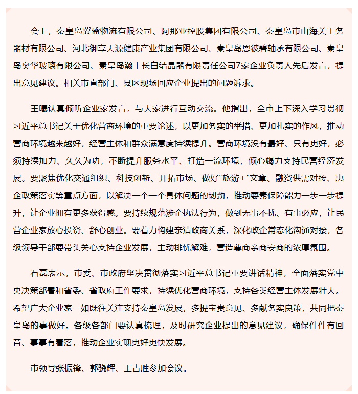 王曦主持召开秦皇岛市企业家恳谈会